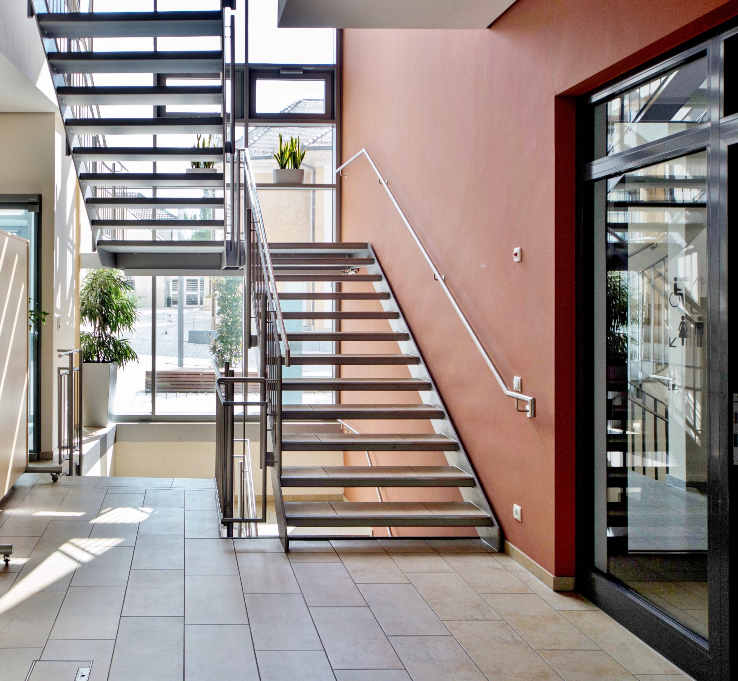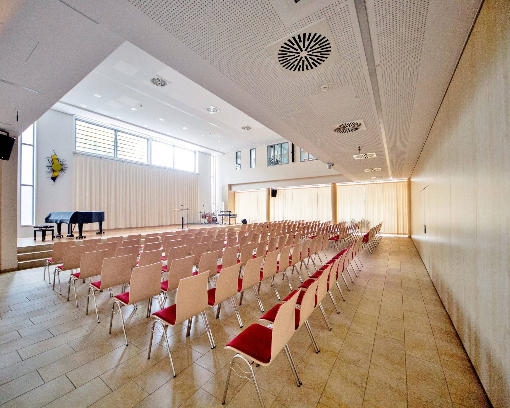 Die Besonderheit innerhalb des Gebäudes besteht in der Herstellung eines möglichst stützenfreien Versammlungsbereiches für ca. 400-500 Personen im EG. Dieser Versammlungsbereich ist in 3 unterschiedliche Nutzungseinheiten unterteilt, die komplett geöffnet und zu einem Gesamtbereich geöffnet werden können.