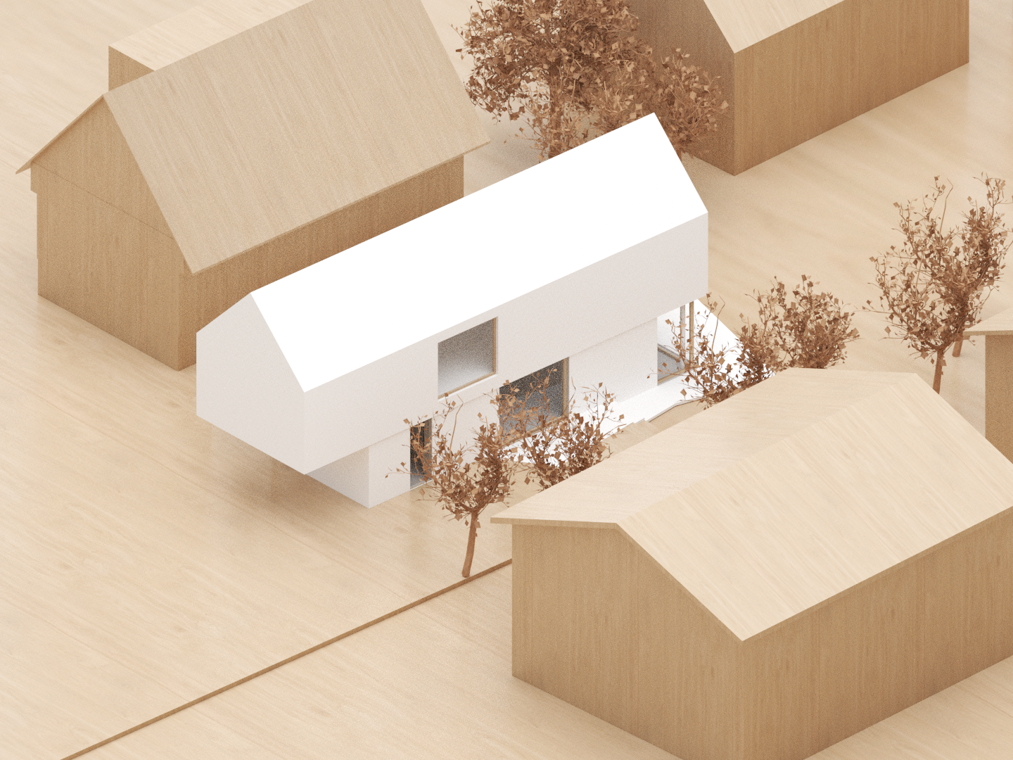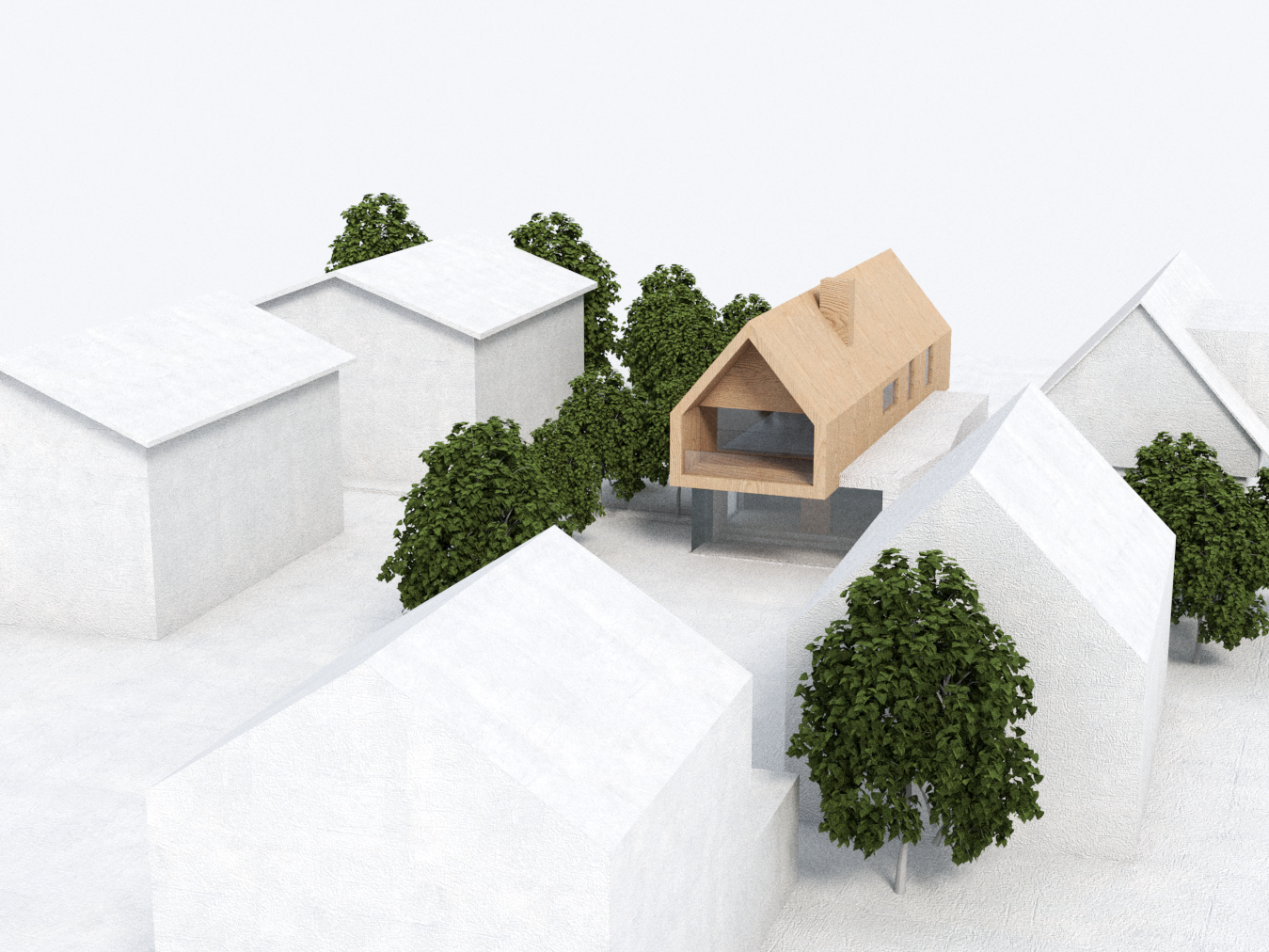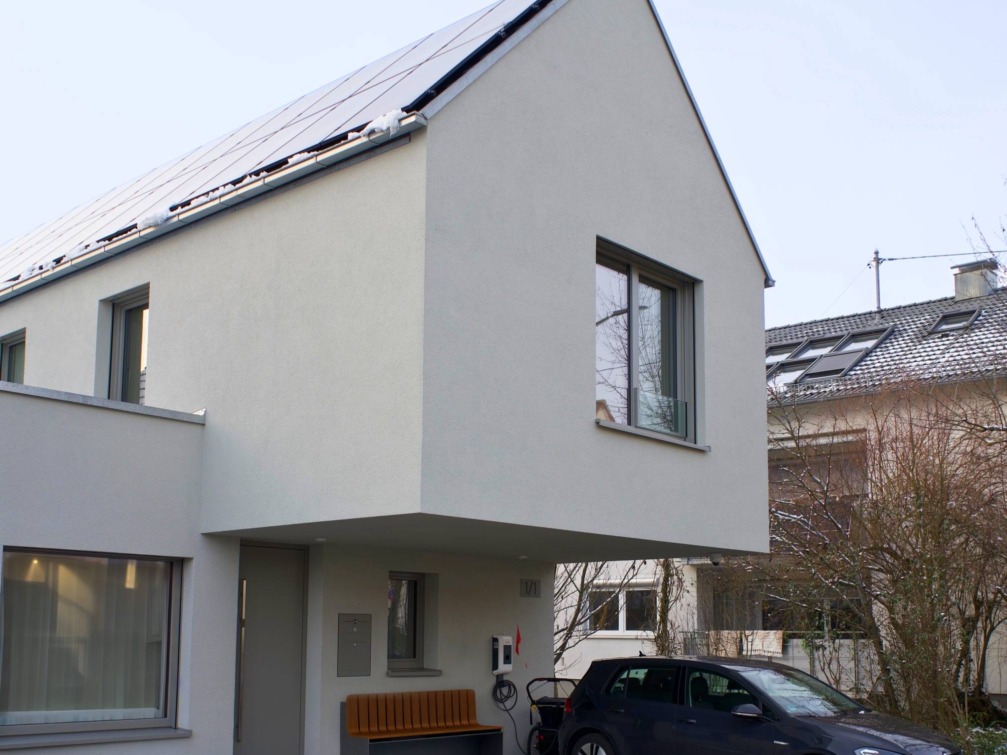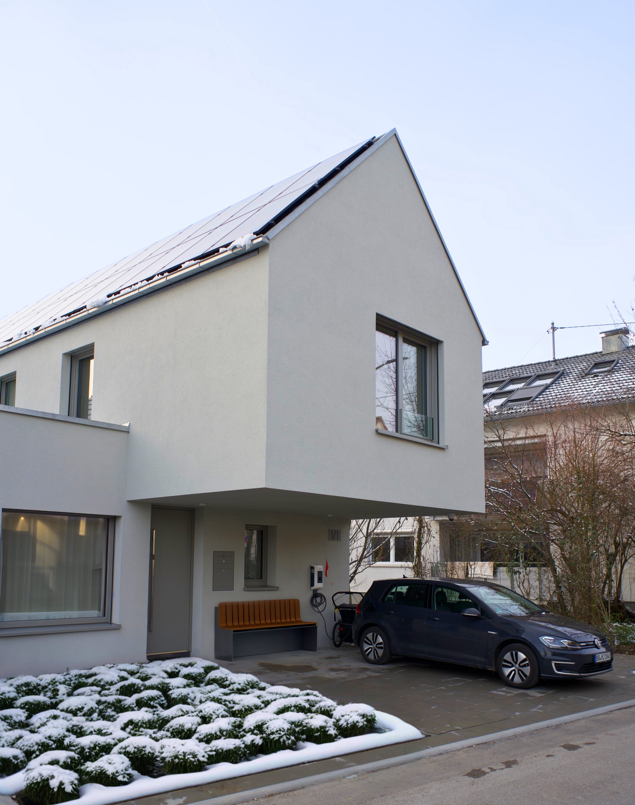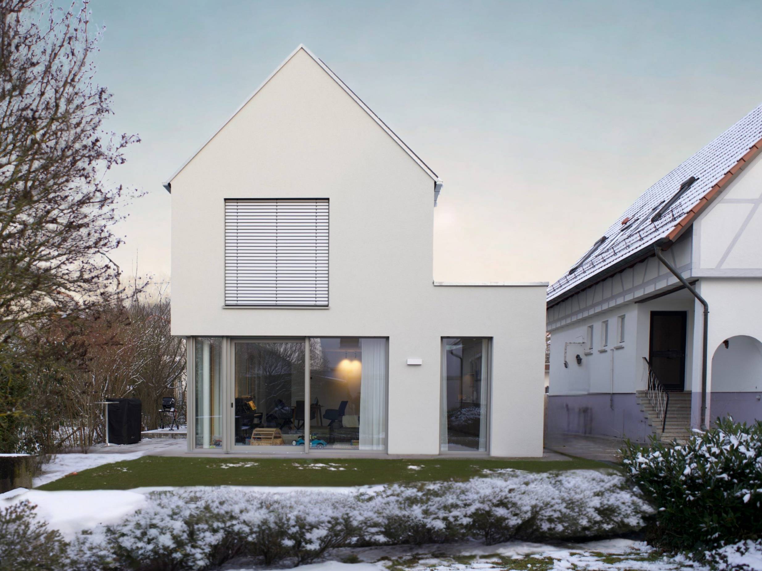 In Warmbronn realisierte Archeplan Architektur ein Wohnhaus für eine junge Familie, dessen Entwurf auf zwei gegeneinander verschobenen Baukörpern basiert. Diese Anordnung reagiert auf die Grundstückssituation und strukturiert die unterschiedlichen Wohnbereiche. Um die Belichtung der Küche trotz einer fensterlosen Brandwand zum Nachbarn sicherzustellen, wurde ein Oberlicht integriert, das eine gleichmäßige Ausleuchtung der Arbeitsflächen ermöglicht. Die interne Erschließung nutzt einen Treppenabsatz, um den Essbereich baulich vom Wohnzimmer zu trennen, während die Sichtachsen erhalten bleiben.