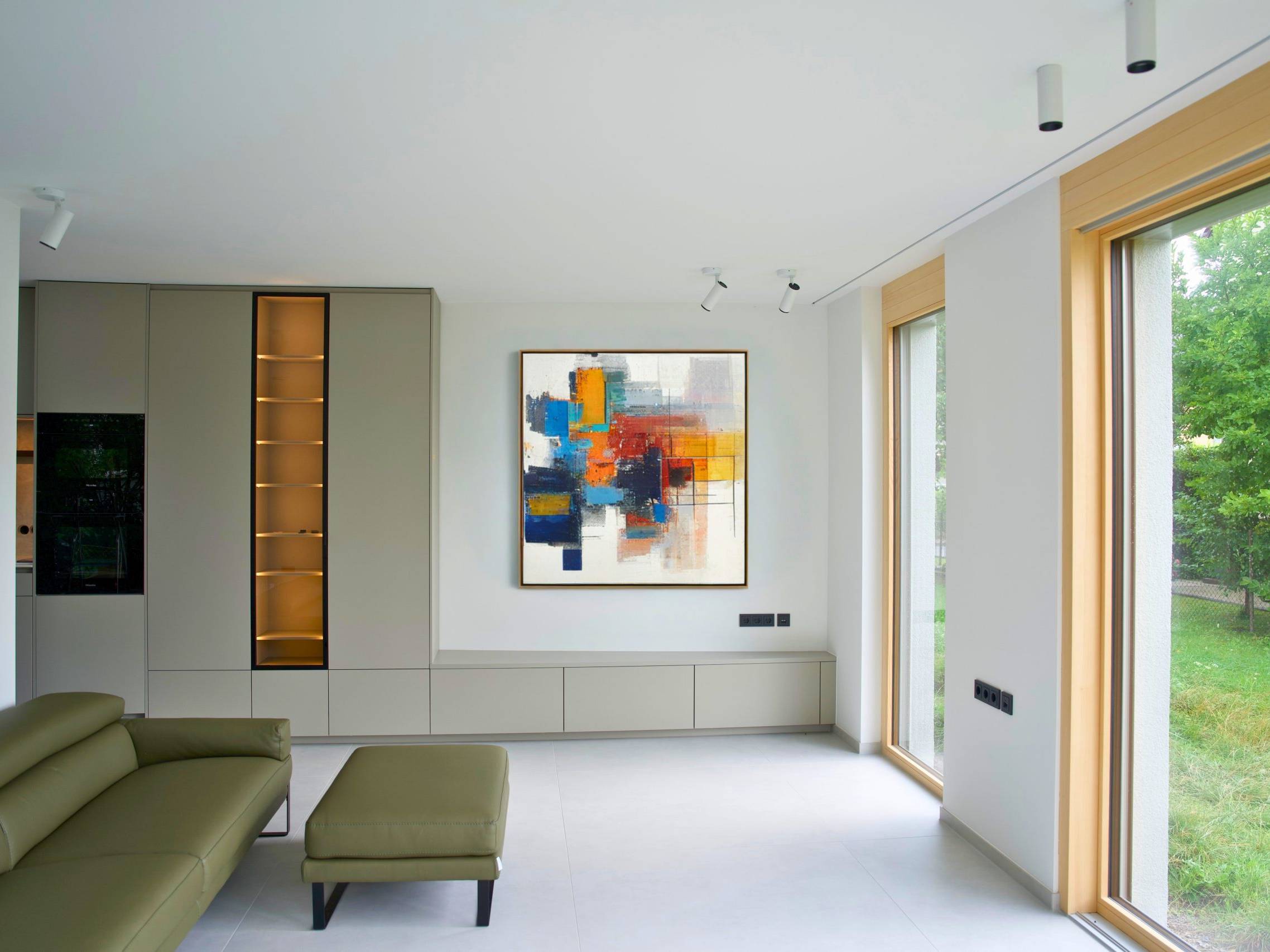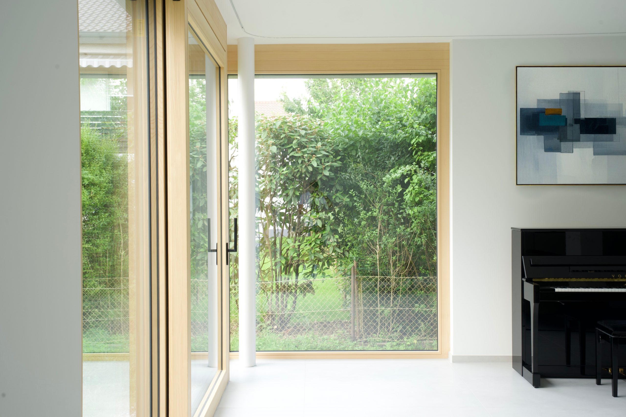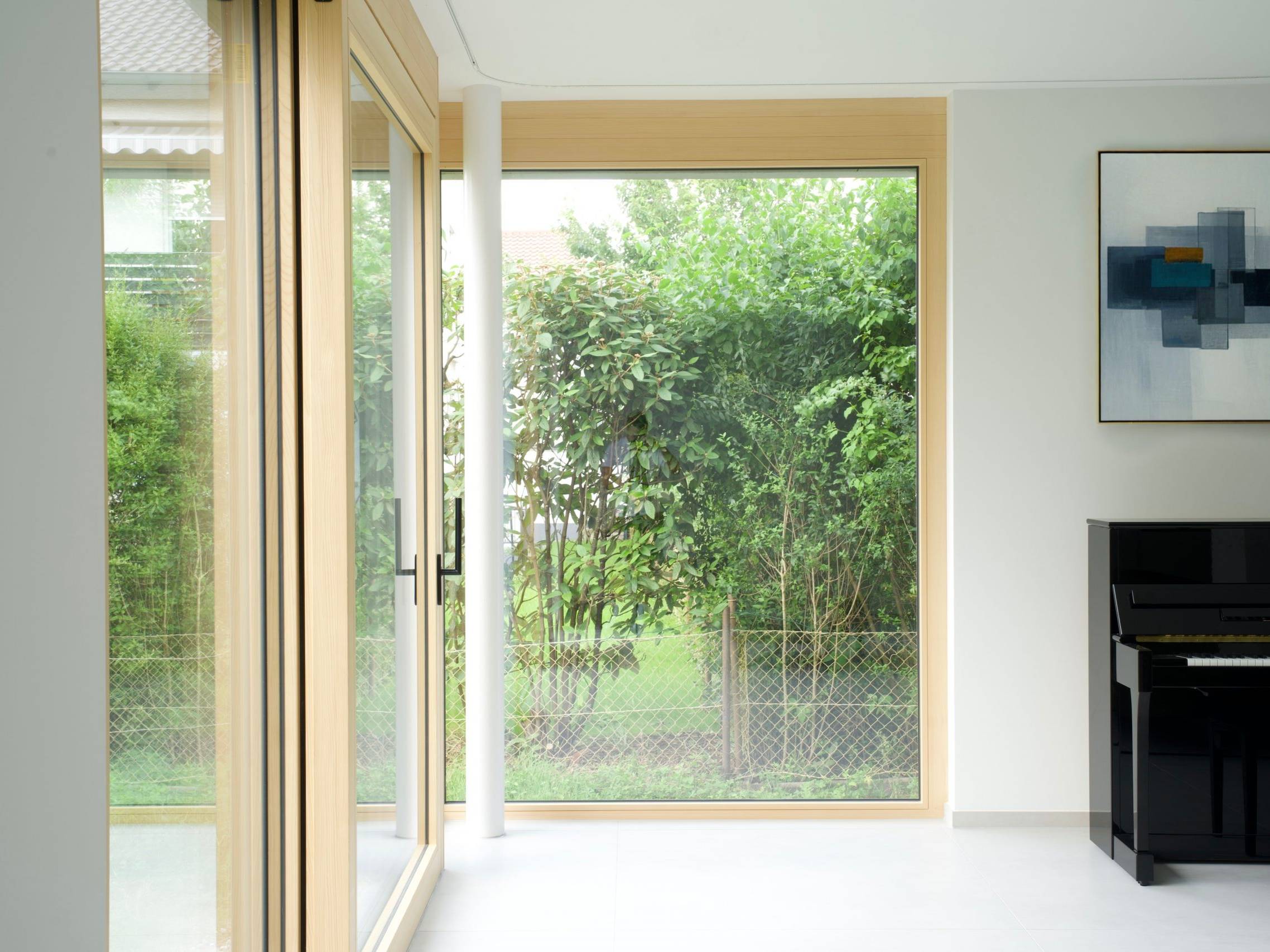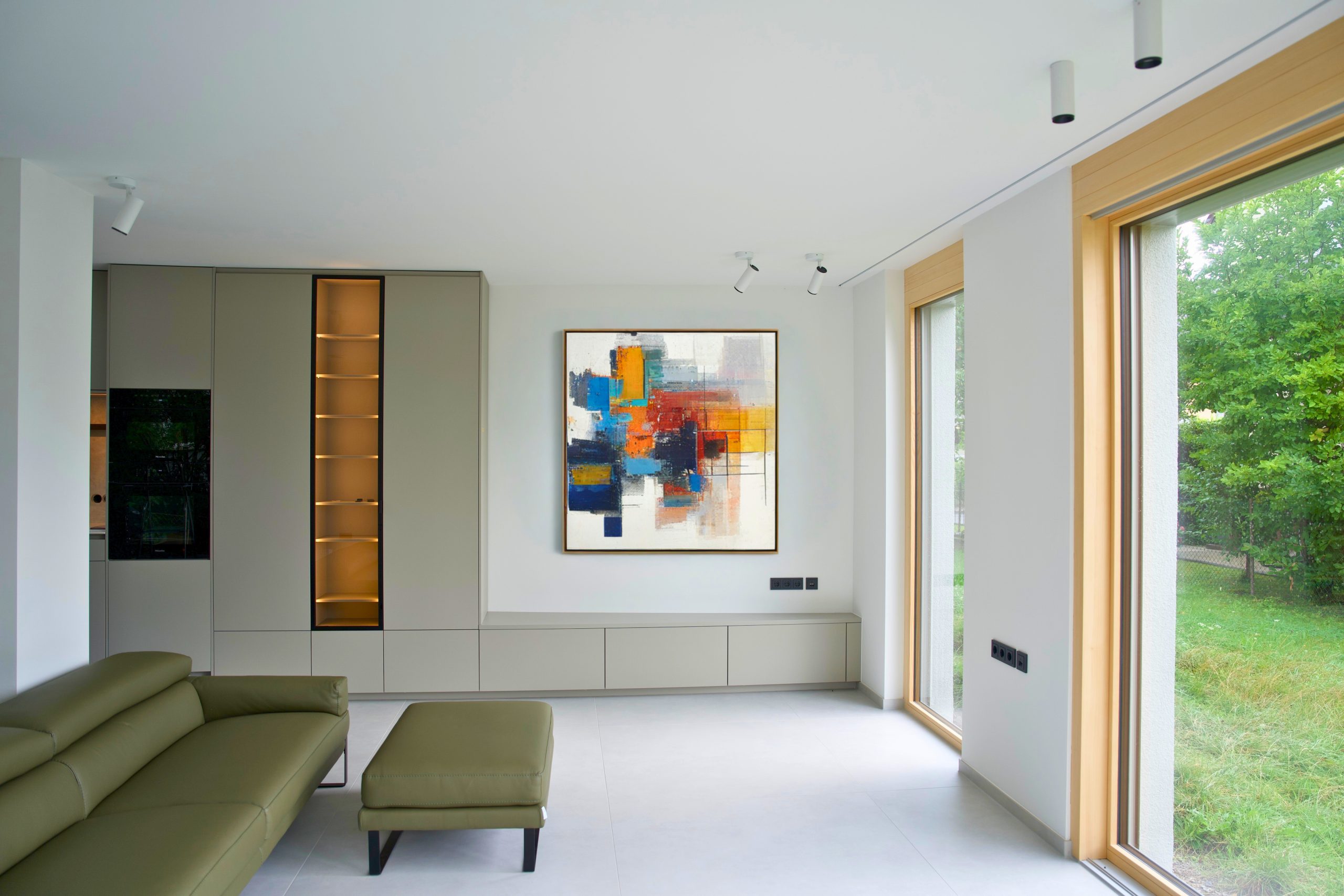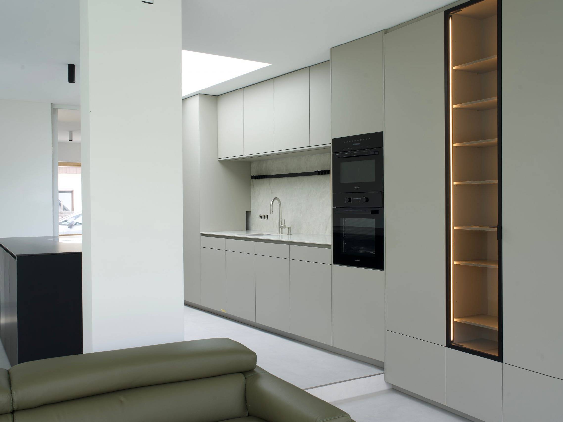 Im Obergeschoss wurden hohe Raumhöhen umgesetzt, die durch ein im Dachgiebel platziertes Arbeitszimmer effizient genutzt werden. Die Materialwahl und der Innenausbau folgen einem einheitlichen Konzept; so verbindet eine maßgefertigte Schrankwand die Funktionen von Garderobe und Küche in einem durchgehenden Möbelelement.