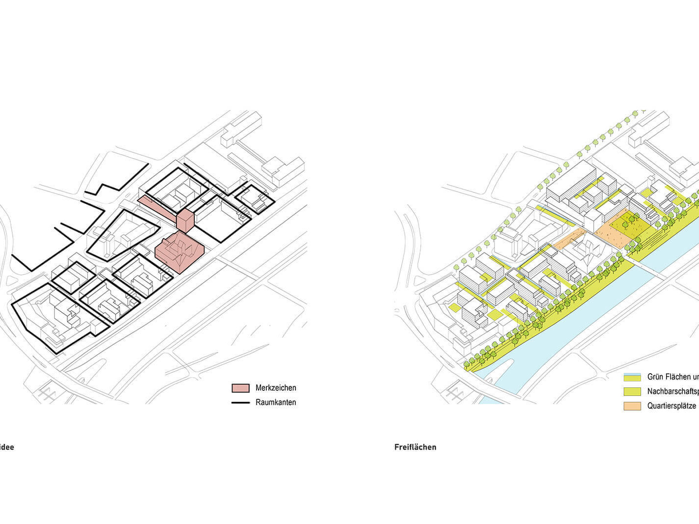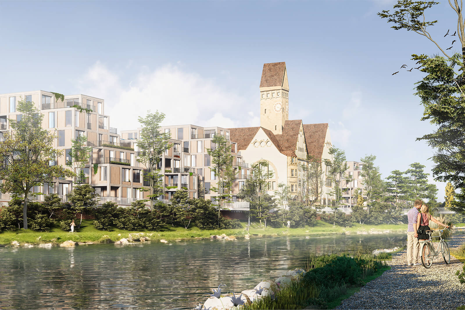 Die exponierte Lage am Flussufer wird dabei für alle Bewohner erlebbar gemacht, indem begrünte Freiflächen und eine vertikale Gebäudebegrünung die natürliche Qualität des Standorts ins Quartiersinnere tragen.