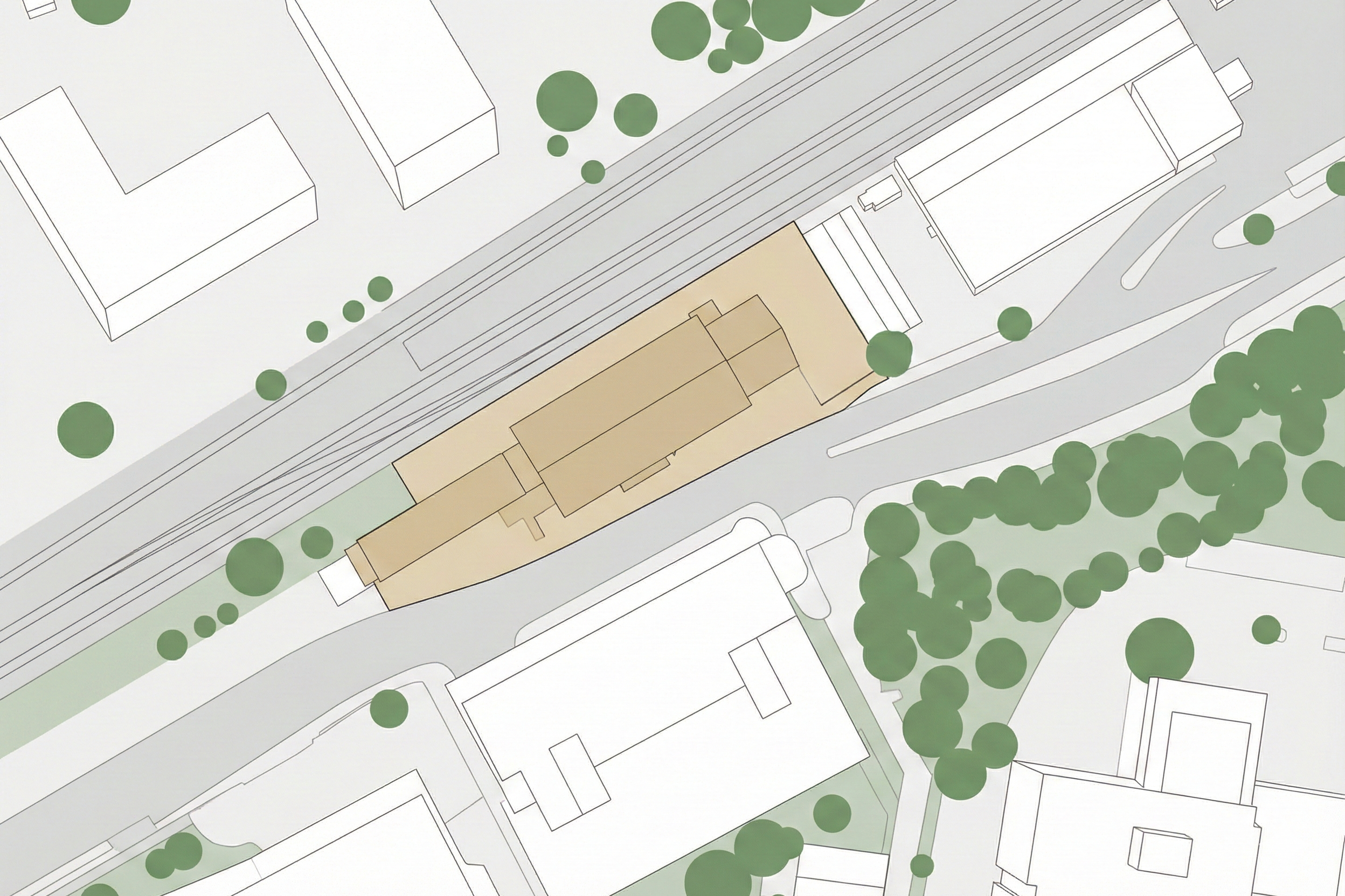 Der Entwurf nutzt die lineare Geometrie des Gleises und transformiert sie in die Form eines klassischen Zugwaggons. Die Gestaltung im Stil eines Pullman-Waggons schafft durch hochwertige Möblierung ein exklusives Ambiente, das direkt an den Bestand anschließt. Durch diese gezielte bauliche Ergänzung wird der begrenzte Raum maximal wirtschaftlich genutzt und gleichzeitig ein atmosphärischer Mehrwert für den Gast geschaffen.
